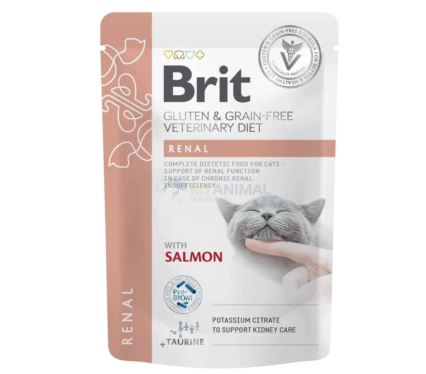 Brit's Veterinary Diet Renal Grain-Free Salmon Feline Pouches is a complete dietetic food for cats with impaired renal function in the case of chronic renal insufficiency Indications : Support of renal function in the case of chronic renal insufficiency FEEDING GUIDELINES: Serve the diet dry or moistened with lukewarm water. It is recommended that a veterinarian's opinion be sought before use or before extending the period of use in all cases. The daily amount should be divided into smaller portions and served throughout the day. Ensure that cat has access to fresh drinking water at all times. Ingredients : Fillets with 85% meat (65% chicken, 15% liver, 5% salmon), hydrolyzed chicken liver 7%, lignocellulose 1.5%, pea flour, calcium carbonate 0.3%, sodium chloride 0.3%, potassium citrate 0.2%, mannan-oligosaccharides 0.0022%, yucca Mojave 0.002%, fructo-oligosaccharides 0.0018%, chitosan 0.007%, inactivated bacteria and parts thereof (Lactobacillus helveticus HA – 122, 1.5x104 cells/kg).