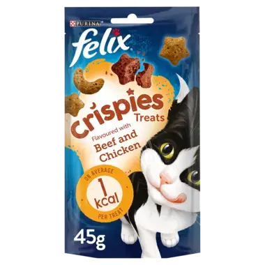 FELIX Crispies flavoured with Beef & Chicken are irresistible cat treats that we're sure your cat will love. Deliciously air-whipped for a light and crispy texture, our tasty treats are the perfect way to surprise your feline friend with a combination of chicken and beef flavours. FELIX Crispies Beef & Chicken cat treats have been created with your cat in mind and provide protein, vitamins and omega 6 fatty acids to your cat to contribute to her overall health and wellbeing . With a crunchy, crispy crackle in every bite, your cat will love the tasty textures and mouth-watering flavours in our FELIX Crispies Beef & Chicken cat treats. We've packed our treats in a handy 45g pouch so treat time is even more convenient and our tasty treats stay fresher for longer. Give the pouch a shake and watch as your cat comes running to the sound of our delicious cat treats and share even more mischievous moments together.