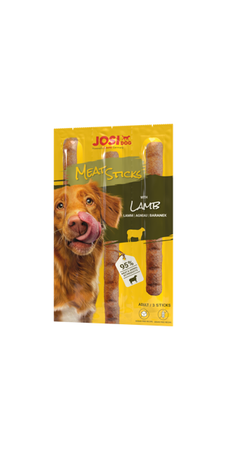 Classy snacks for classy dogs: juicy meat sticks with lamb for adult dogs "Treat time! Here are your JosiDog Meat Sticks with lamb!" Our furry friends love these snacks — deliciously meaty, with a tempting aroma and fabulous flavour. These soft chews for adult dogs have everything. And that's not all: thanks to their shape, these training snacks are easy to split into portions, which means they are an ideal treat, reward or snack between meals. Of course, the chews are also perfect for travelling. The practical pack contains 3 individually wrapped JosiDog Meat Sticks. Packaging size: 33g/3pieces