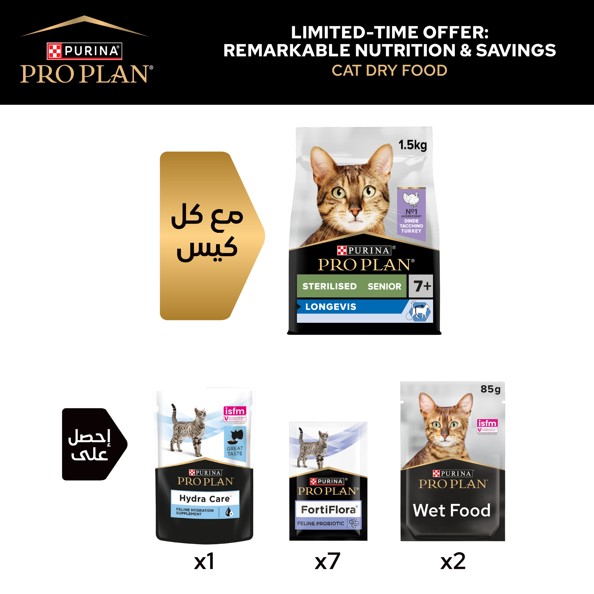 This complete and balanced dry cat food is tailored for sterilised senior cats agaed 7 and above. Enriched with Longevis, a patented blend proven to support longevity and vitality, this formula helps maintain kidney health, mobility, ideal weight, and strong natural defences.
