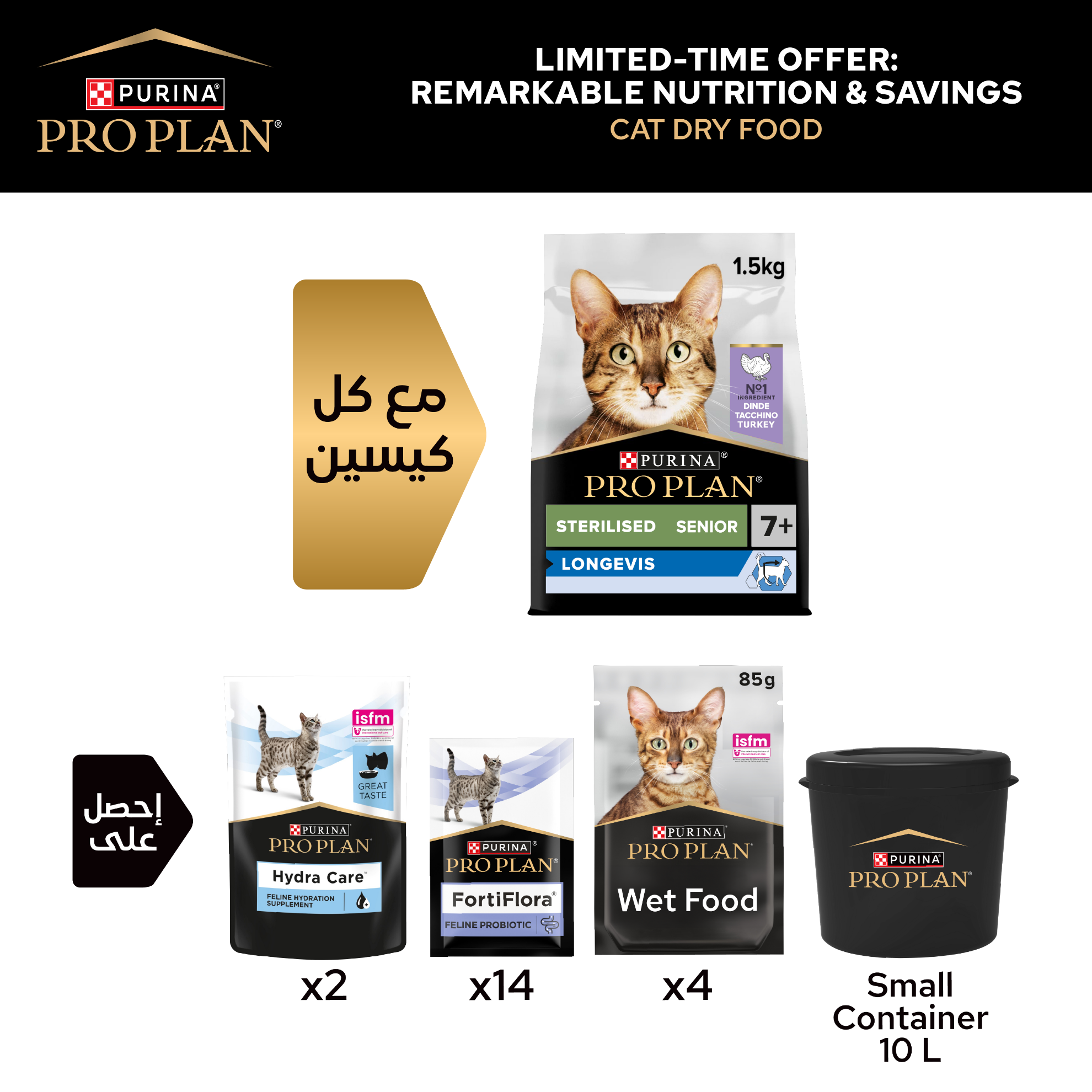 This complete and balanced dry cat food is tailored for sterilised senior cats agaed 7 and above. Enriched with Longevis, a patented blend proven to support longevity and vitality, this formula helps maintain kidney health, mobility, ideal weight, and strong natural defences.