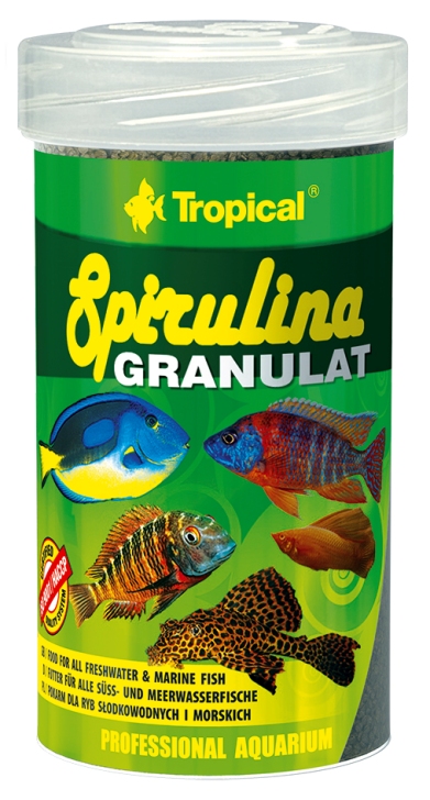 Tropical Spirulina Granules is a food in the form of slowly sinking granules with the addition of spirulina (6%) for everyday feeding of herbivorous and omnivorous fish in freshwater and marine tanks. Spirulina platensis is the source of easily-assimilable protein, vitamins and trace elements, which ensure proper growth, development and excellent condition. It is also rich in natural carotenoids, which intensify colours and positively affect many physiological processes, including growing and breeding. The addition of zeolite promotes a healthy digestive system and the release of toxins from fish’s bodies. Feeding recommednation Tropical Spirulina Granules: Feed your aquarium fish several times per day, using small portions. Complete feedingstuff for ornamental fish. Ingredients: derivatives of vegetable origin, algae (Spirulina platensis min. 6%), cereals, vegetable protein extracts, fish and fish derivatives, molluscs and crustaceans, yeasts, oils and fats, minerals (including zeolite 1%). Additives (per kg): Vitamins, pro-vitamins and chemically well-defined substances having similar effect: vit. A 29 800 IU, vit. D3 1 900 IU, vit. E 100 mg, vit. C 550 mg. Compounds of trace elements: E1 (Fe) 37.8 mg, E6 (Zn) 10.5 mg, E5 (Mn) 7.8 mg, E4 (Cu) 1.8 mg, E2 (I) 0.23 mg, E8 (Se) 0.23 mg, E7 (Mo) 0.05 mg. Colourants. Antioxidants. Analytical constituents: crude protein 48.0%, crude oils and fats 7.0%, crude fibres 3.5%, moisture 10.0%