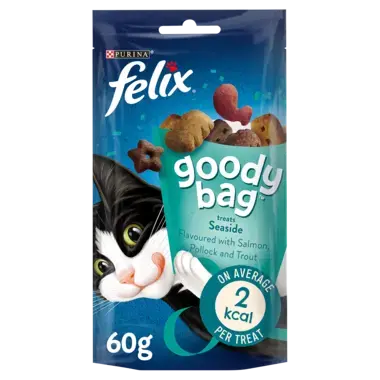 Our delicious FELIX Goody Bag Seaside Mix flavoured with salmon, pollock & trout are the ideal treat for fish lovers. With a tasty combination of three delicious fishy flavours, these tasty snacks are triple the treat! Our cat treats have been specially formulated to ensure they are full of flavour with a tasty, crispy crunch in every bite. We're sure your cat will love these yummy treats that are perfect at any time of day.