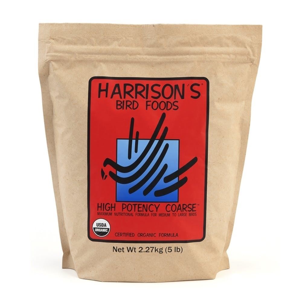 Year-round formula for all medium to large parrots, especially African greys, cockatoos, large conures, eclectus, macaws and pionus. Other species may be switched to Adult Lifetime Formula after a 6-month conversion period. Conversion: All birds should start out and remain on High Potency Formula for a period of at least 6 months. Special needs: For birds that are molting, overweight, underweight, particularly active, housed in a cold climate, recovering from an illness or affected by liver or kidney disease. Weaning Birds: Feed High Potency Formula for at least 6-9 months. Breeding Birds: Birds should be fed High Potency Formula 1-2 months prior to the breeding period and until chicks are weaned or for at least six months before resuming Adult Lifetime Formula. The amount of supplemental certified organic vegetables and fruits may be increased until the chicks are weaned. For each 2 Tbs (20 g) formula, add ½ Tbs (5 g) certified organic peanuts or almonds and 1Tbs (10 g) certified organic sunflower seeds. Storage: Harrison's Bird Foods do not contain artificial preservatives. Once opened, a bag of Harrison's should be used up within 6 weeks. Storing food in fridge or freezer helps maintain freshness. Note "use before" dating printing on bag.