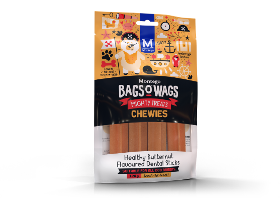 Healthy Butternut Flavoured Dental Sticks Highly nutritious, wagtastically delicious, BAGS O’ WAGS are the treats dogs love to get and they’re full of yummy goodness. Ingredients: Corn starch, chicken meal, water, glycerine, wheat gluten, milk powder (lactose-reduced), propylene glycol, sugars, dehydrated butternut, chicken fat, sodium hexametaphosphate, fish oil, carrageenan. ADDITIVES: SENSORY: Palatability meat-based enhancers with chicken aroma; orange colourant. PRESERVATIVES: Potassium sorbate. Typical analysis: Crude protein 11.5% Moisture 18.5% Total fat 5.5% Crude fibre 0.5% Omega-6 fatty acids 1.5% Omega-3 fatty acids 0.3% Sugars 5.5% Metabolisable energy 400 kcal/lOO g