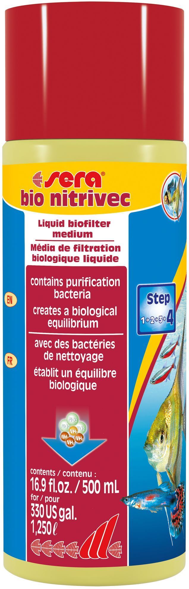 Premium class liquid filter medium Breaks down food remainders, ammonium and nitrite biologically Provides settling area for useful purification bacteria Creates a biologically active living environment The dangerous toxic substances ammonium and nitrite are being formed permanently in aquarium water. sera bio nitrivec, a sera biotechnology product, contains millions of purification bacteria, by whose support a stable biological equilibrium forms quickly and reliably so the occurring toxic substances are broken down continuously. The additionally included mineral volcanic rock removes pollutants, effectively binds cloudiness and provided suitable settling area for the purification bacteria. For healthy, clear and biologically active water. Allows adding fish already after 24 hours when combined with sera aquatan!