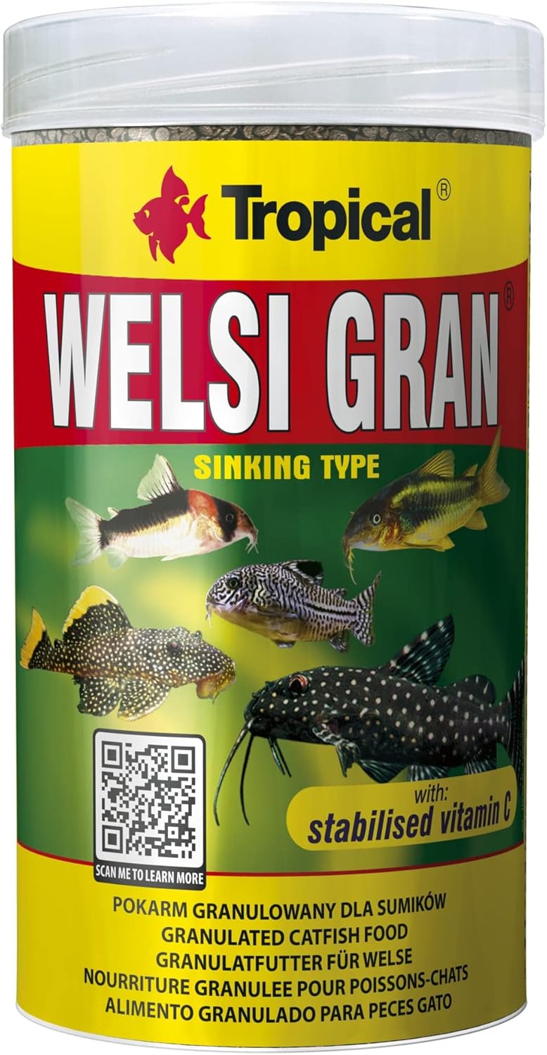 🐾 Ideal for Catfish & Bottom-Feeders: TROPICAL WELSI GRAN is a specially formulated sinking granule food, designed for catfish and other bottom-feeding aquarium fish. 🦠 Immune Support with Vitamin C: Enriched with stabilized vitamin C, this food supports your fish’s immune system, helping them fight off diseases and stress. 🐟 High Acceptance by Fish: The granules soften quickly upon contact with water, making them easier for fish to consume and ensuring high acceptance, even by picky eaters. 🍽️ Complete & Nutritious Diet: A multi-ingredient food offering balanced nutrition for bottom-feeding species, making it a perfect staple or supplement to your fish’s diet. ✅ Easy Feeding: Feed in small portions several times per day to ensure your fish receive the nutrition they need for healthy growth and activity.